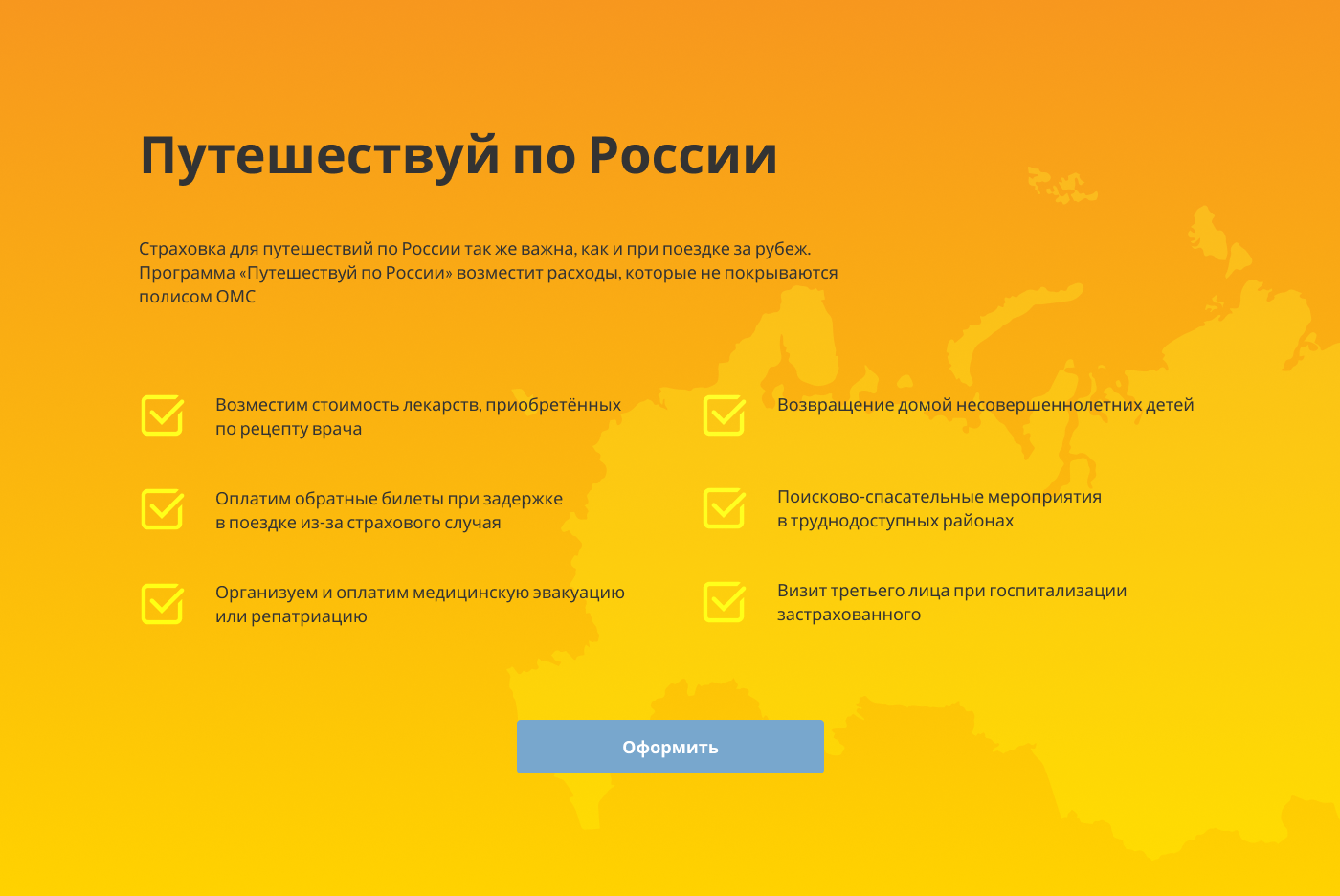 Страховка для путешествий по России так же важна, как и при поездке за рубеж. Программа «Путешествуй по России» возместит расходы, которые не покрываются полисом ОМС
