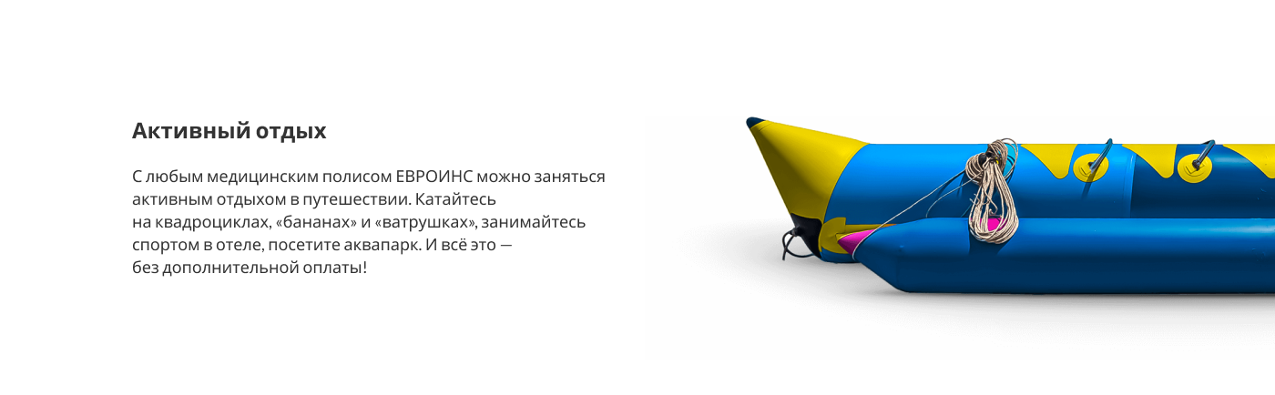 С любым медицинским полисом ЕВРОИНС можно заняться активным отдыхом в путешествии. Катайтесь на квадроциклах, «бананах» и «ватрушках», занимайтесь спортом в отеле, посетите аквапарк. И всё это — без дополнительной оплаты!